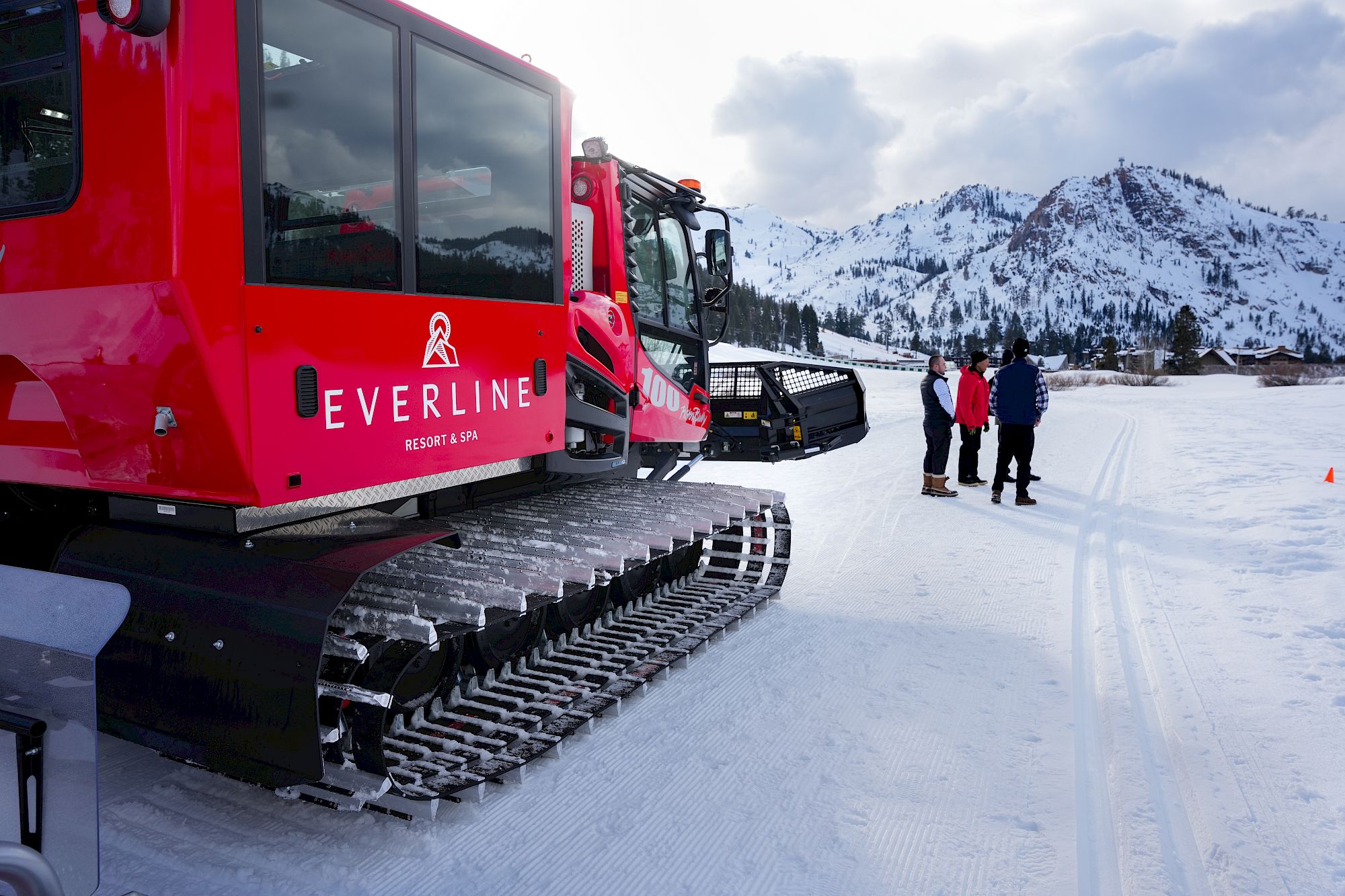 A person dressed in red steps into a large red snowcat vehicle on a snowy mountain with pine trees and a lodge in the background.