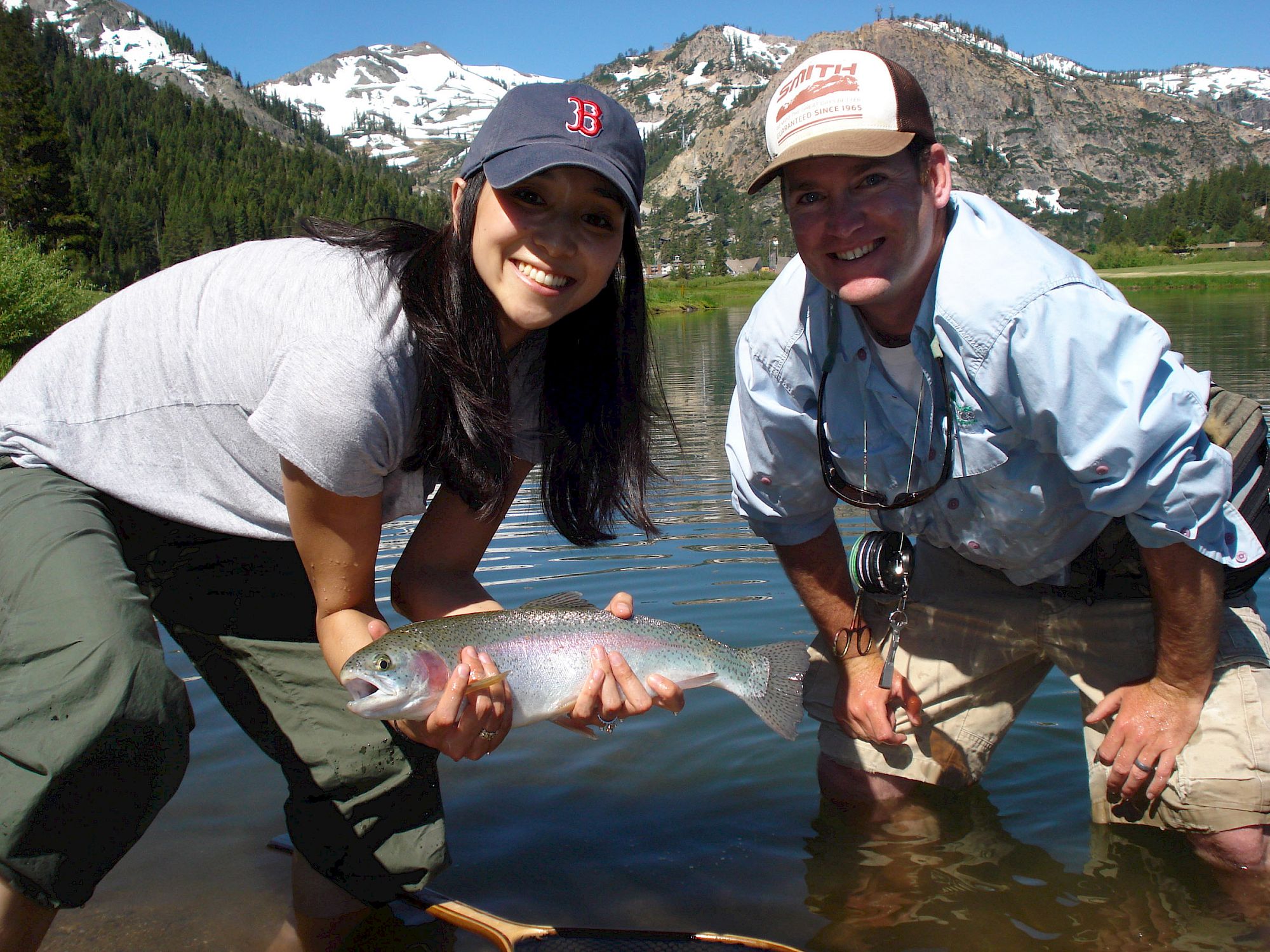 Two people are standing in a lake holding a fish, with mountains and trees in the background.