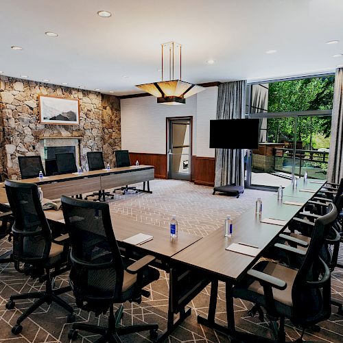 A modern conference room with a large table, several office chairs, water bottles, notepads, a TV screen, large windows with curtains, and a stone wall.